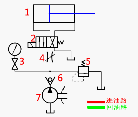 油路說明:在進(jìn)油管路上設(shè)置節(jié)流閥,控制液壓油流量,進(jìn)而控制活塞桿移動(dòng)速度